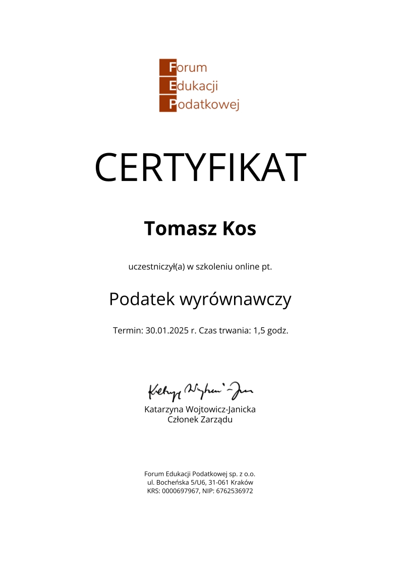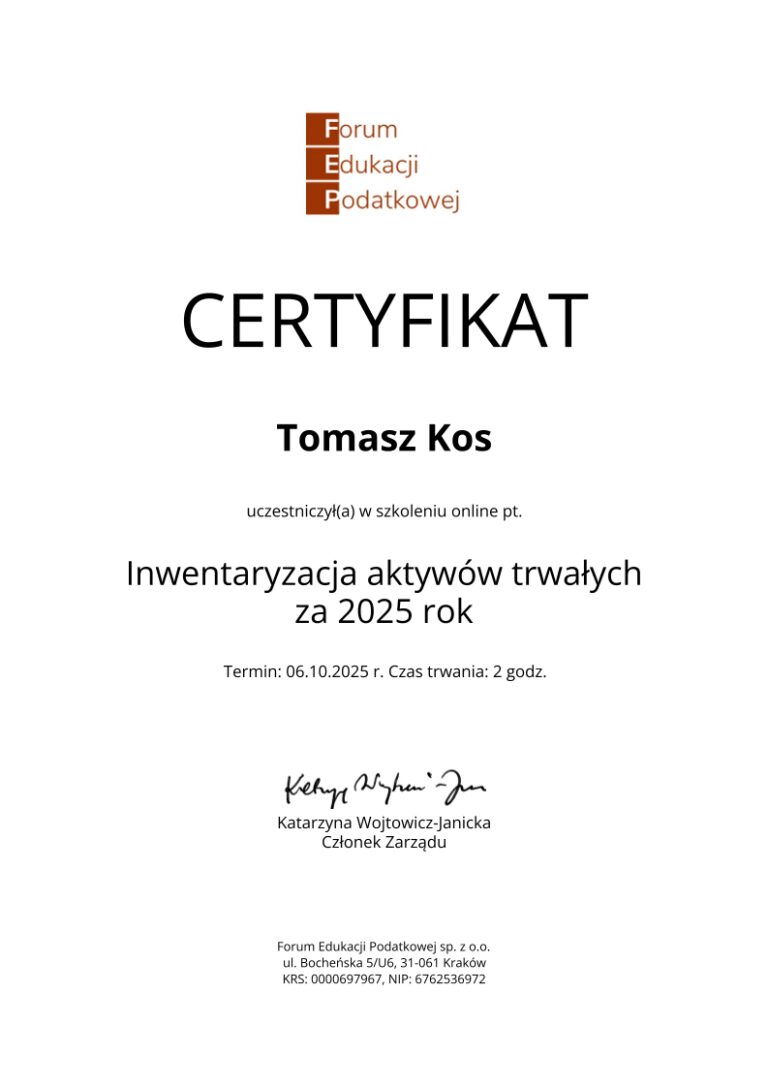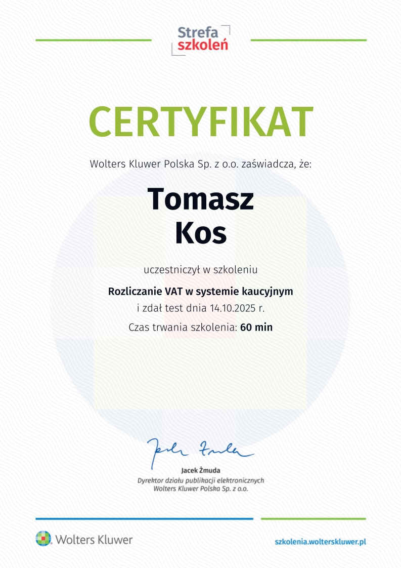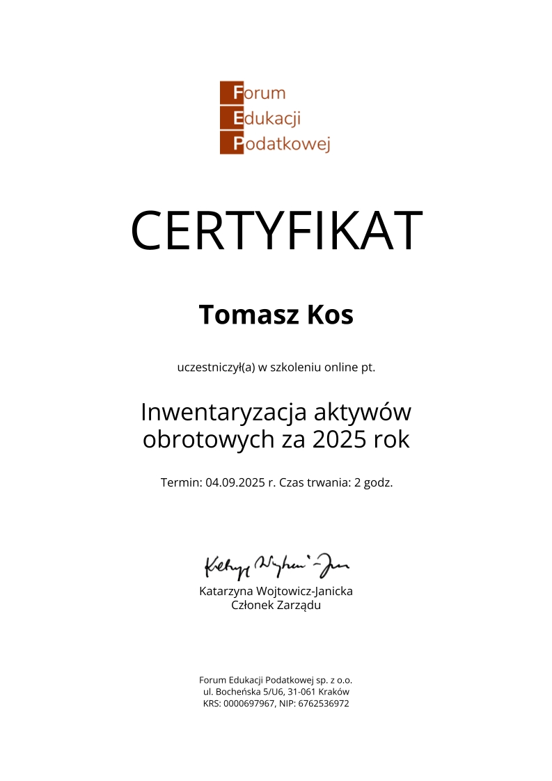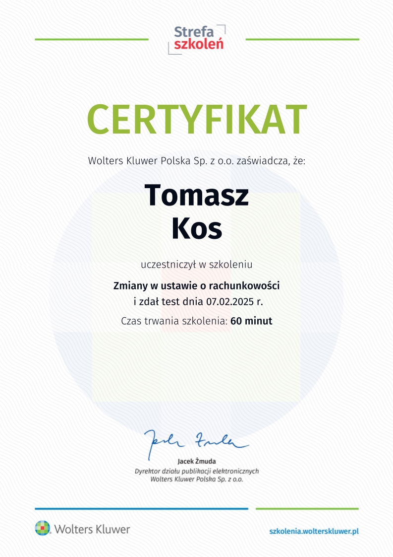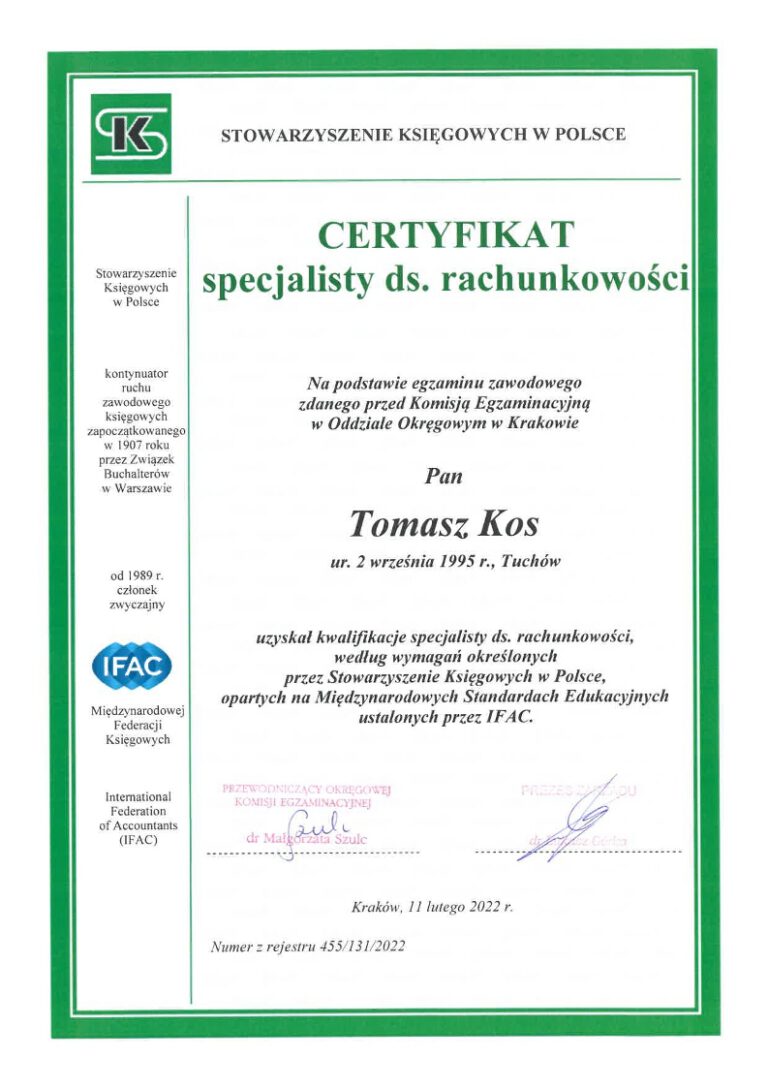 Kancelaria księgowa TOMAccounter powstała w maju 2023 roku w odpowiedzi na rosnące potrzeby przedsiębiorców poszukujących rzetelnego, technologicznie zaawansowanego i indywidualnego wsparcia księgowego. Jej założycielem jest Tomasz Kos – specjalista z wieloletnim doświadczeniem w branży finansowej i rachunkowej, absolwent matematyki finansowej i aktuarialnej na Akademii Tarnowskiej oraz magister Finansów i Rachunkowości Uniwersytetu Ekonomicznego w Krakowie.