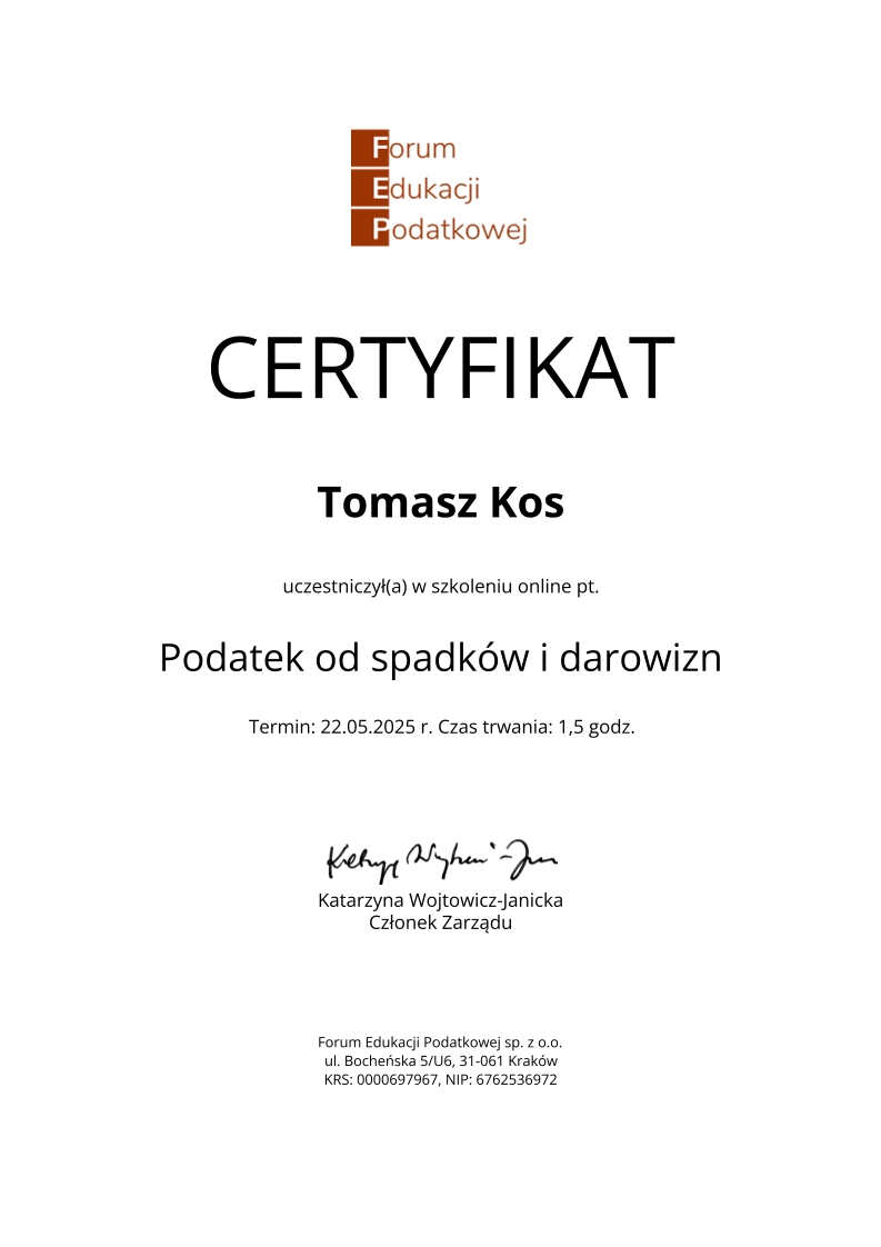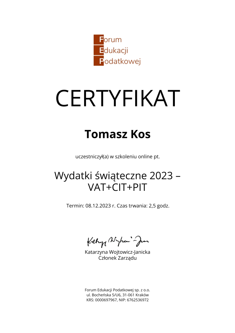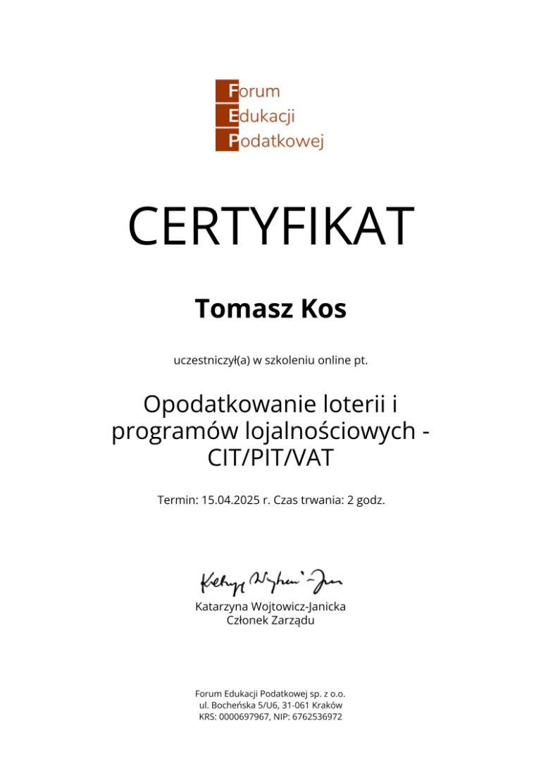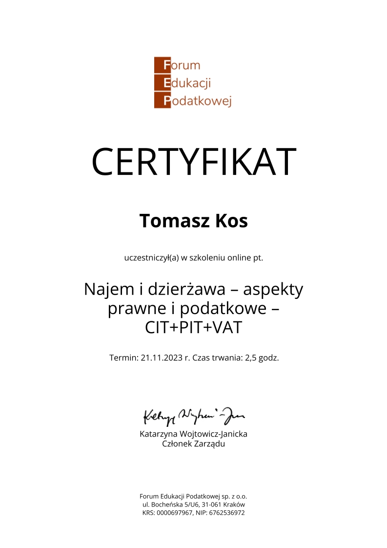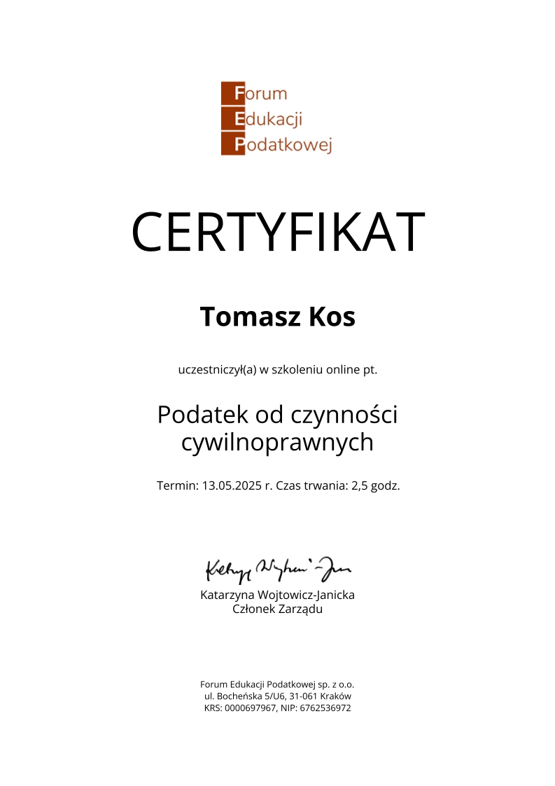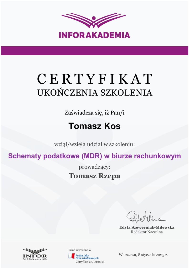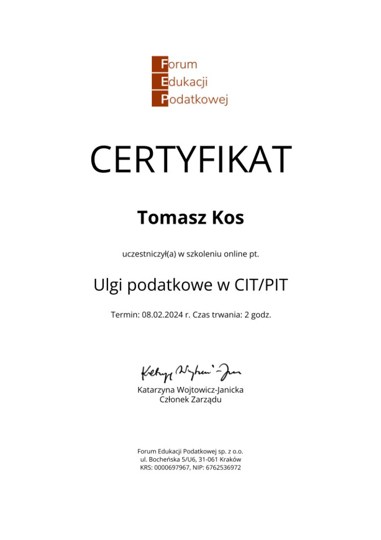 Kancelaria księgowa TOMAccounter powstała w maju 2023 roku w odpowiedzi na rosnące potrzeby przedsiębiorców poszukujących rzetelnego, technologicznie zaawansowanego i indywidualnego wsparcia księgowego. Jej założycielem jest Tomasz Kos – specjalista z wieloletnim doświadczeniem w branży finansowej i rachunkowej, absolwent matematyki finansowej i aktuarialnej na Akademii Tarnowskiej oraz magister Finansów i Rachunkowości Uniwersytetu Ekonomicznego w Krakowie.