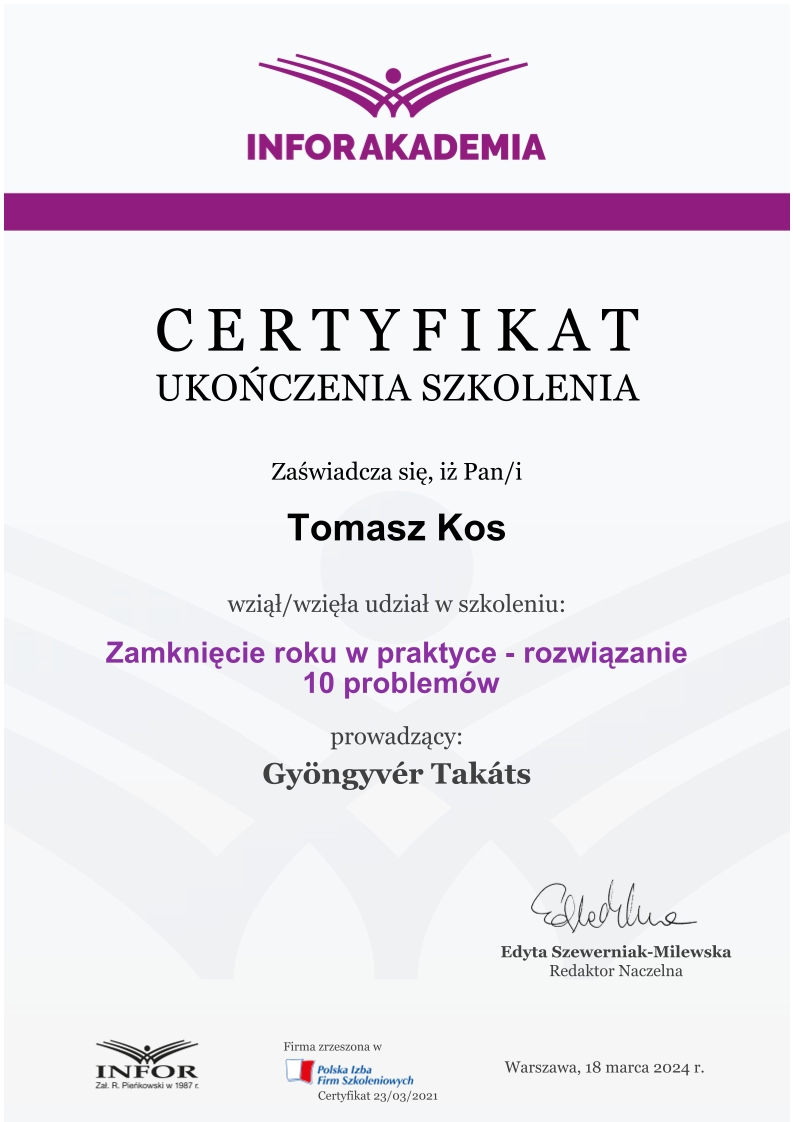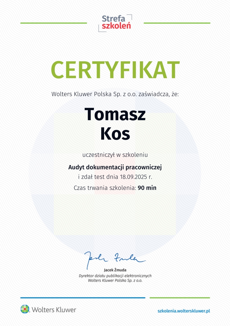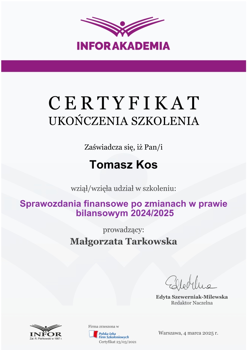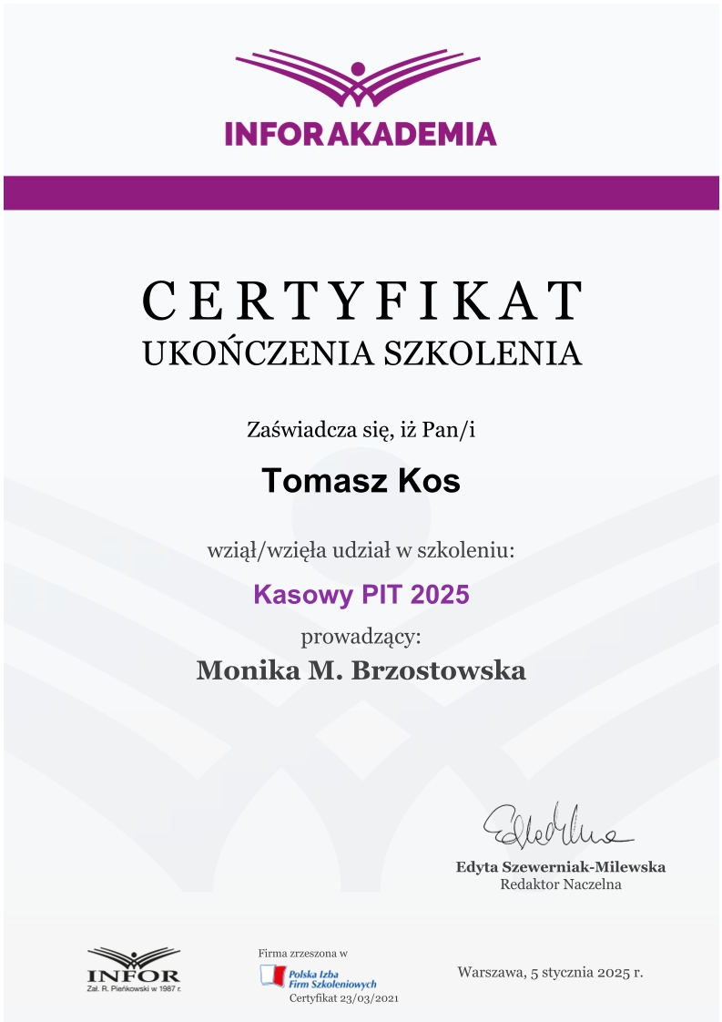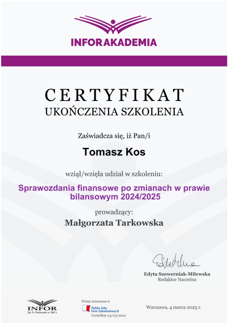 Zdobywał praktykę w biurach rachunkowych już od 2018 roku, przechodząc przez kolejne szczeble zawodowe – od stażysty po głównego księgowego. Jego doświadczenie obejmuje prowadzenie ksiąg dla firm z sektora TSL, przedsiębiorstw handlowo-usługowych, a także obsługę podmiotów korzystających z estońskiego CIT. Od lat zajmuje się również wewnętrznym audytem ksiąg i zaawansowaną konfiguracją systemu enova365, tworząc schematy, bazy i rozwiązania automatyzujące procesy finansowo-księgowe.