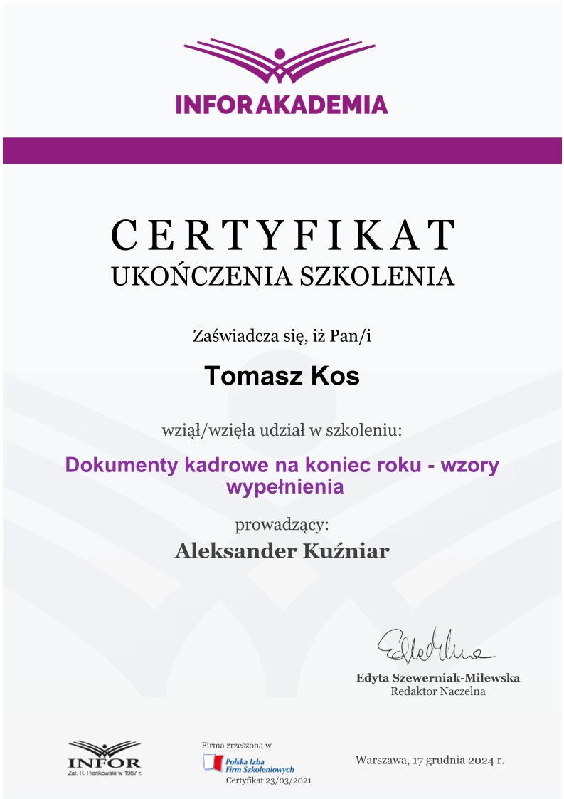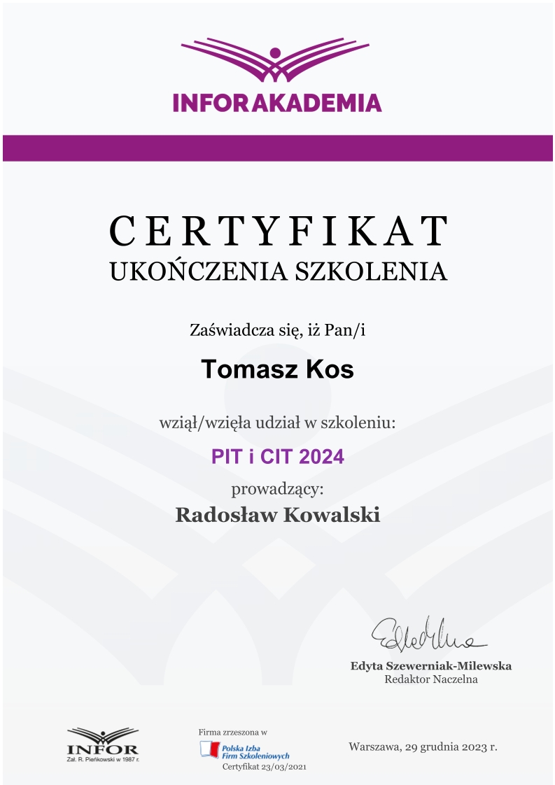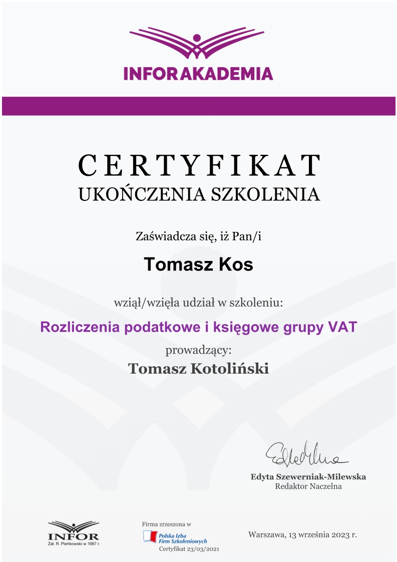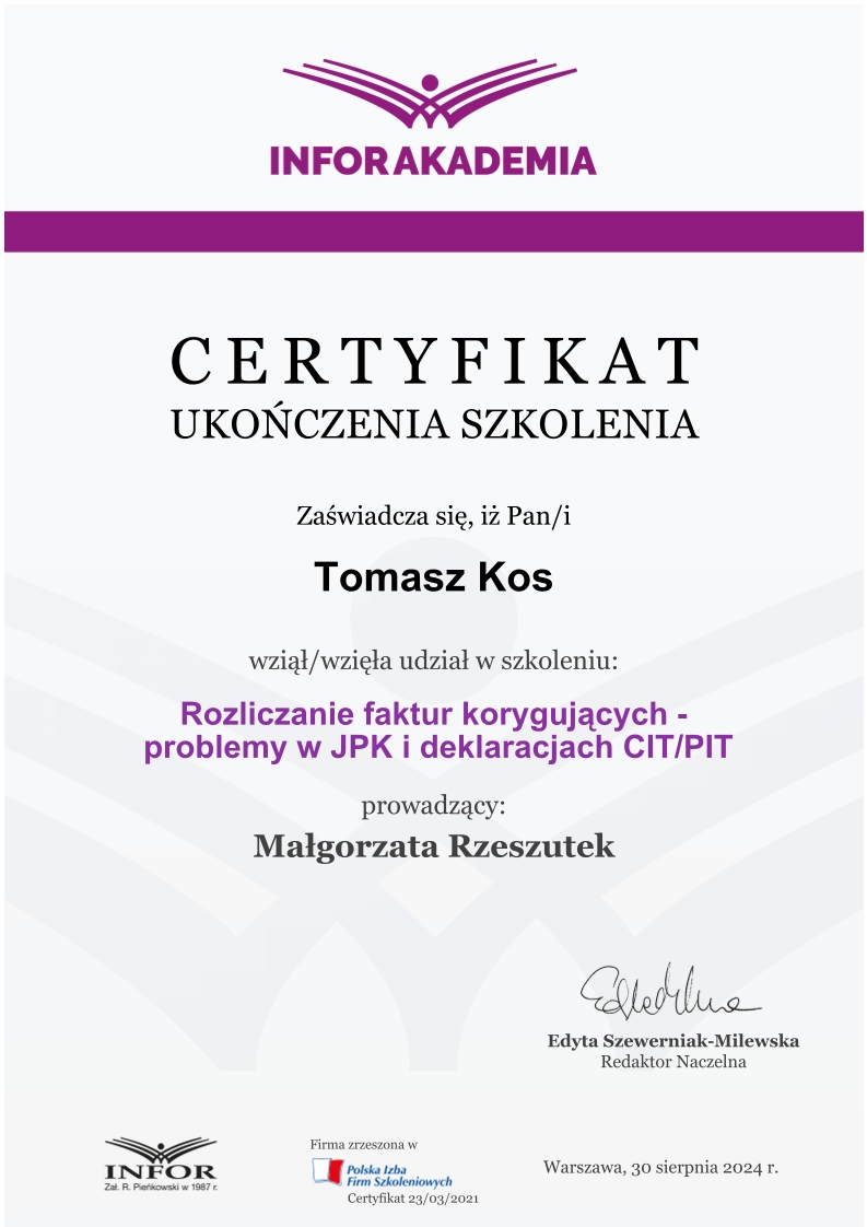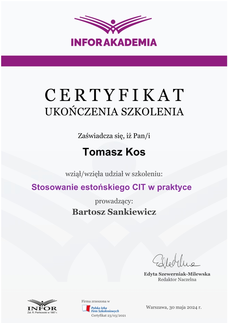 Zdobywał praktykę w biurach rachunkowych już od 2018 roku, przechodząc przez kolejne szczeble zawodowe – od stażysty po głównego księgowego. Jego doświadczenie obejmuje prowadzenie ksiąg dla firm z sektora TSL, przedsiębiorstw handlowo-usługowych, a także obsługę podmiotów korzystających z estońskiego CIT. Od lat zajmuje się również wewnętrznym audytem ksiąg i zaawansowaną konfiguracją systemu enova365, tworząc schematy, bazy i rozwiązania automatyzujące procesy finansowo-księgowe.