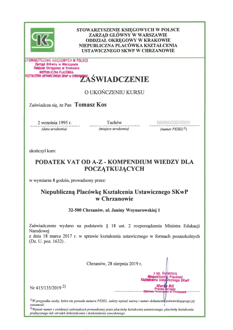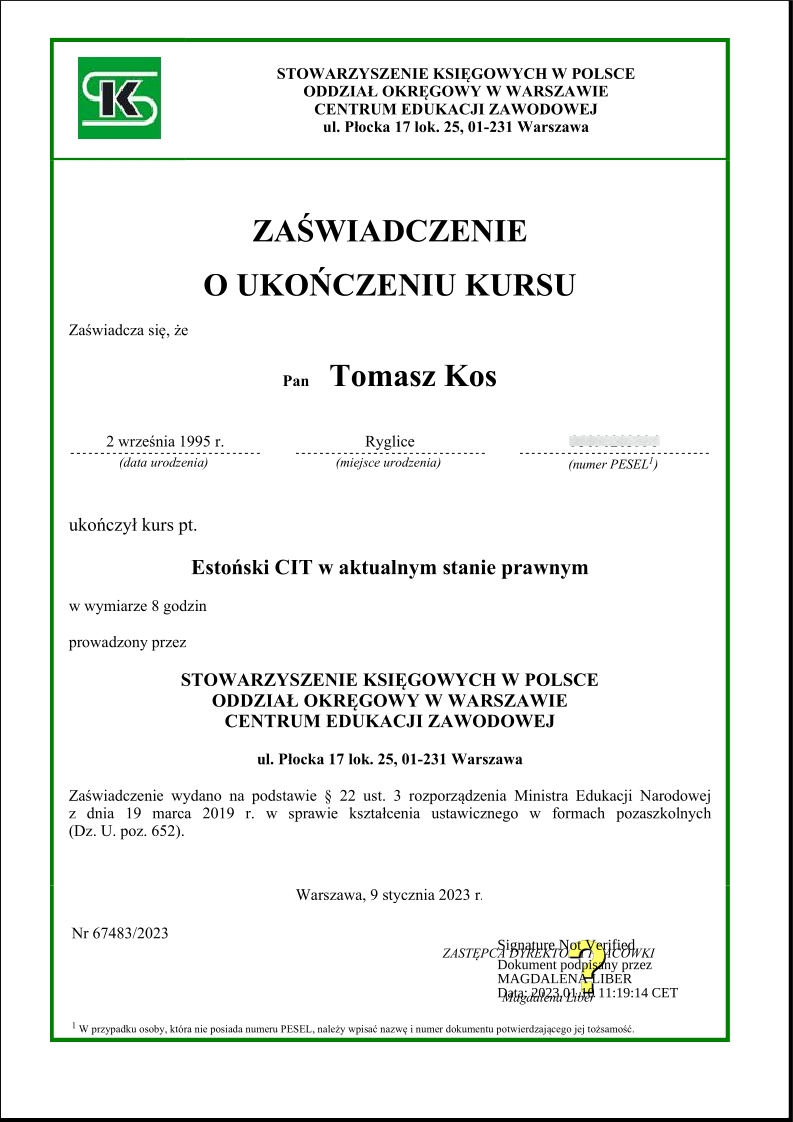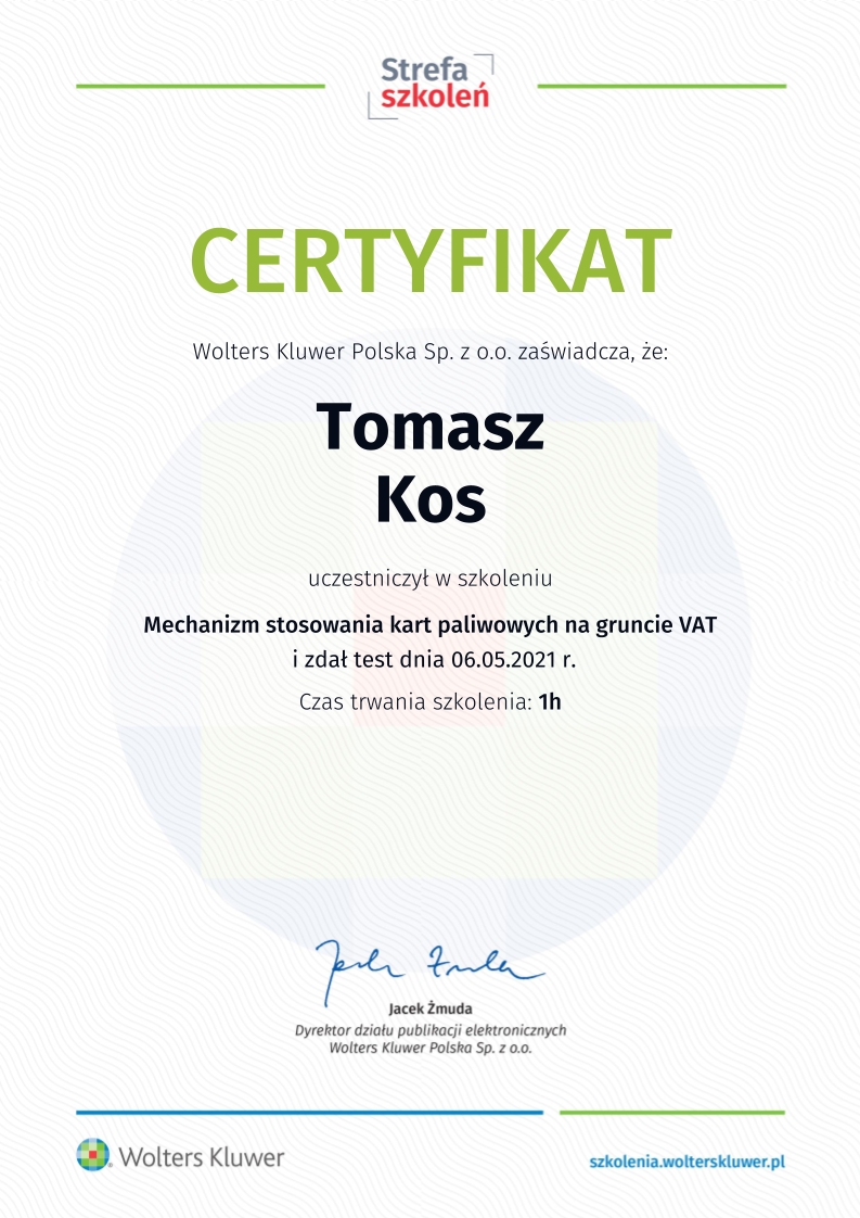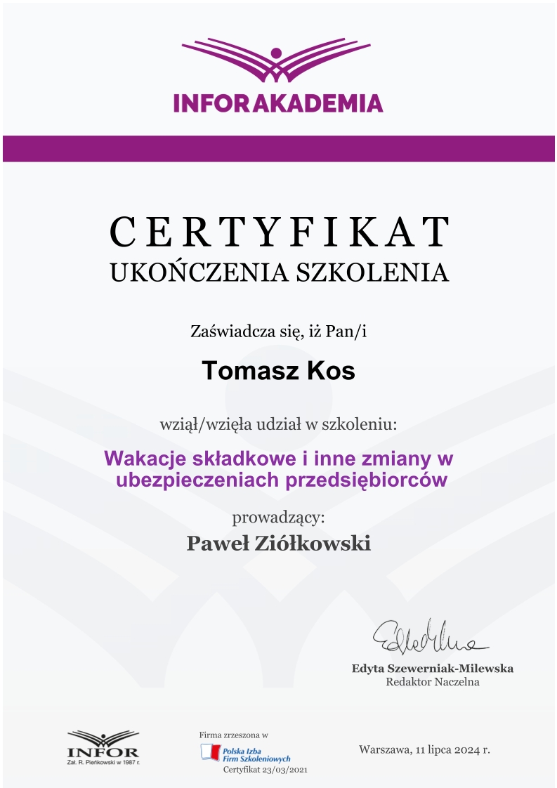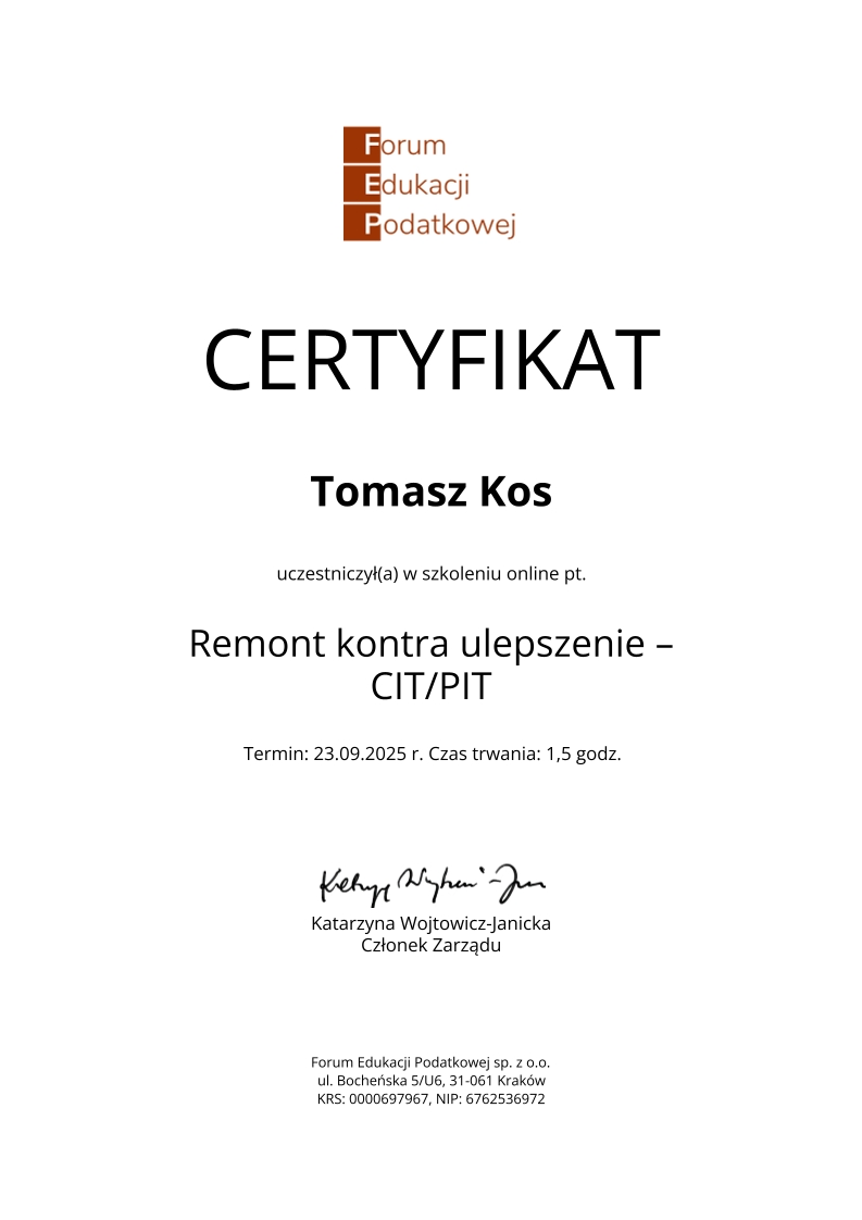 Zdobywał praktykę w biurach rachunkowych już od 2018 roku, przechodząc przez kolejne szczeble zawodowe – od stażysty po głównego księgowego. Jego doświadczenie obejmuje prowadzenie ksiąg dla firm z sektora TSL, przedsiębiorstw handlowo-usługowych, a także obsługę podmiotów korzystających z estońskiego CIT. Od lat zajmuje się również wewnętrznym audytem ksiąg i zaawansowaną konfiguracją systemu enova365, tworząc schematy, bazy i rozwiązania automatyzujące procesy finansowo-księgowe.