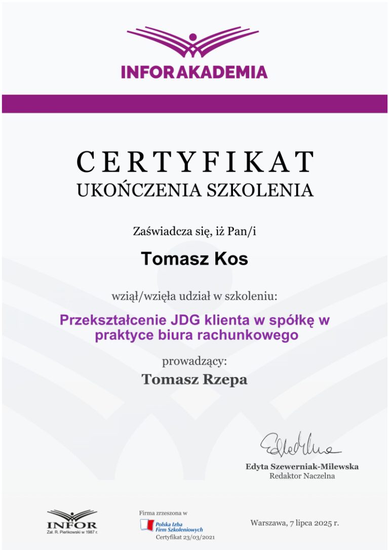 Kancelaria TOMAccounter łączy solidną wiedzę merytoryczną z nowoczesnym podejściem do prowadzenia księgowości. Dzięki wykorzystaniu narzędzi cyfrowych możliwa jest w pełni zdalna obsługa klientów z całej Polski, przy jednoczesnym zachowaniu wysokich standardów bezpieczeństwa, terminowości i komunikacji.